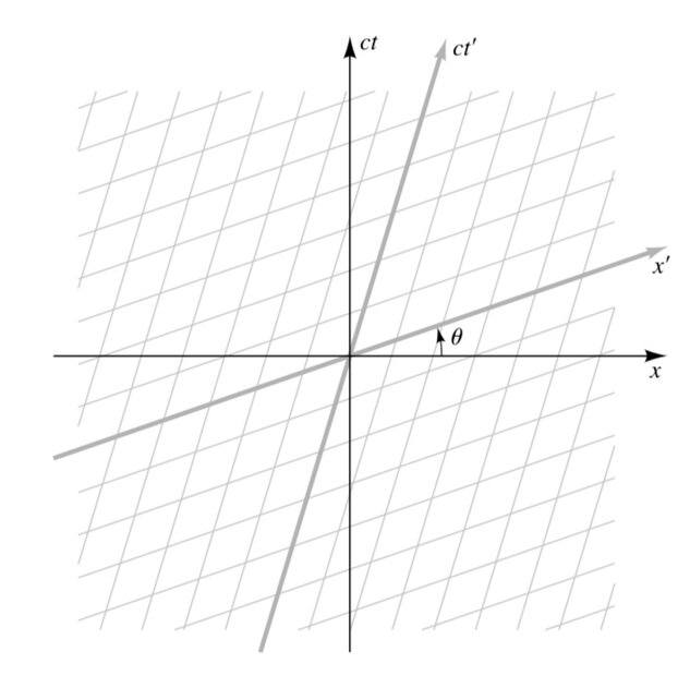 "FIGURE 4.13 A Lorentz boost as a change of coordinates on a spacetime diagram. The figure shows the grid of ##\left(c t^{\prime}, x^{\prime}\right)## coordinates defined by ##(4.18)## plotted on a ##(c t, x)## spacetime diagram. The ##\left(c t^{\prime}, x^{\prime}\right)## coordinates are not orthogonal to each other in the Euclidean geometry of the printed page. But they are orthogonal in the geometry of spacetime. (Recall the analogies between spacetime diagrams and maps discussed in Example 4.1.) The ##\left(c t^{\prime}, x^{\prime}\right)## axes have to be as orthogonal as the ##(c t, x)## axes because there is no physical distinction between one inertial frame and another. The orthogonality is explicitly verified in Example 5.2. The hyperbolic angle ##\theta## is a measure of the velocity between the two frames"
