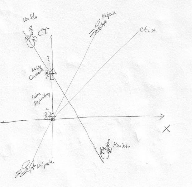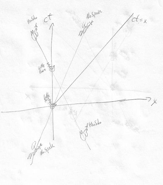 Time later he pass another spaceship coming at the same absolute speed (in a frame at rest respect the non traveller twin) but with opposite direction, to left, and with no aceleration, and the captain of this spaceship take a Polaroid photo of his Polaroid photo and paste it looking outwards in one of his spaceship window.