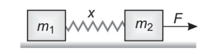 - Two bars of masses ##m1## and ##m2## are connected by an ideal spring and are kept on a floor with friction. The coefficient of friction is ##k##. Find the minimum constant force to be applied to mass ##m2## in order to shift the bar.