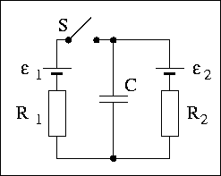 The switch S has been open for a long time. Determine the magnitude of the electric charge stored by the capacitor. Use the following data: C = 3.43 mF, ε1 = 11.0 V, ε2 = 31.9 V, R1 = 3.66 Ω, R2 = 5.04 Ω.