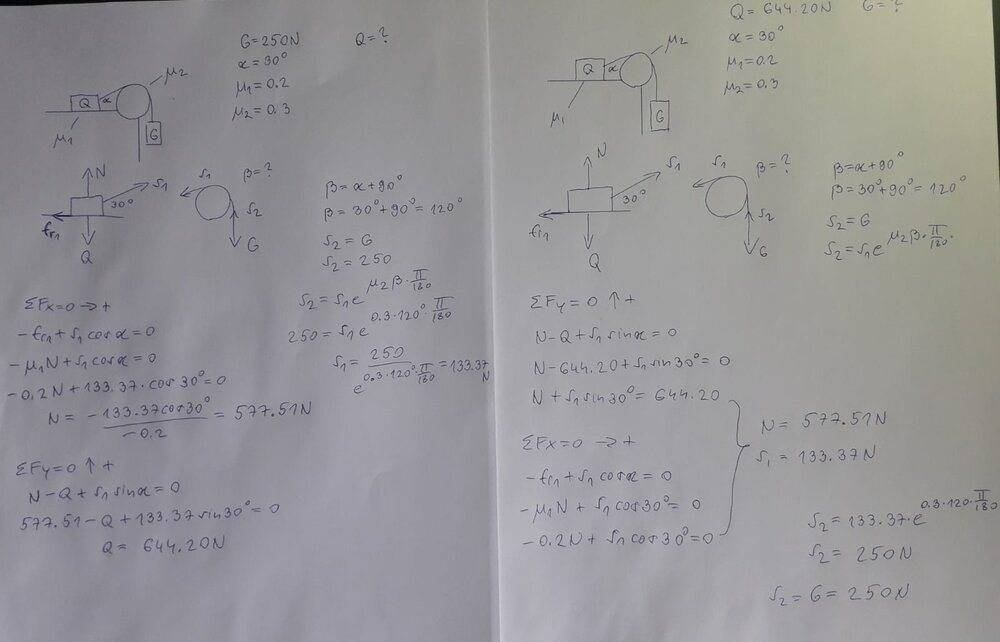 The discussion focuses on the mechanics of two blocks connected by a rope over a pulley, specifically analyzing the balance of forces represented by weights G1 and G2. The participants clarify that the correct symbols are G and Q, and emphasize the importance of the Capstan equation in determining the tension in the rope. The balance is achieved when the angle α is maintained, and the friction coefficient μ plays a crucial role in the calculations. The final tension calculated using the Capstan equation is confirmed to be 133.37 N, based on a weight of 250 N and a friction coefficient of 0.3.