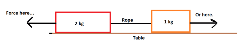 The discussion revolves around the mechanics of two blocks connected by a fragile rope, specifically examining how the maximum force applied to the blocks affects the tension in the rope and whether this depends on which block is being pulled. The scope includes theoretical considerations and practical implications of force application.