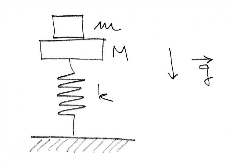 The discussion centers on calculating the amplitude of oscillation for a two-body system involving a mass M connected to a vertical spring, with a second mass m placed on top. The key equations referenced include mg = kx and mgh = 0.5kx², which relate gravitational force and spring force. The condition that mass m remains on top of mass M without jumping is crucial for determining the amplitude of oscillation. The participants emphasize the importance of a thorough analysis before arriving at a solution.