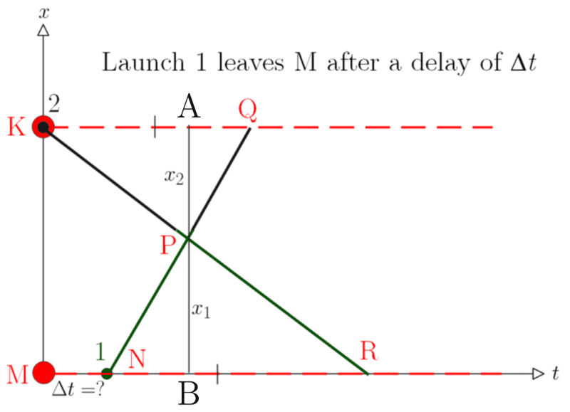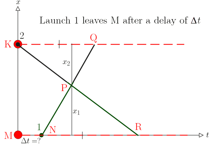 As before, there are two cases - when the launches leave simultaneously and when launch 1 leaves M after a delay of time ##\Delta t.##