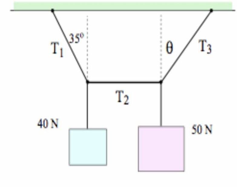 - There are two blocks with weights 40N and 50N. The first block is connected to the ceiling at an angle 35 degrees to the left by rope 1 with tension T1 while the second block is connected to the ceiling by rope 3 with tension T3. In between, the first and second block is rope 2 with tension T2. Find T1, T2, T3, and theta. Refer to the attached image.