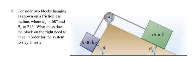 Homework Statement: Consider two blocks hanging on a frictionless incline where theta one is 60 and theta two is 24, what mass does the block on the right need to have in order for the system to stay at rest