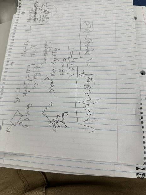 then I found the x and y components of both blocks like the normal force in both directions so I can set the y direction stuff like Ny and Ty equal to MG I just don’t know how I can solve my equations without having the normal force component of it in order to take the sin and cosine of it.