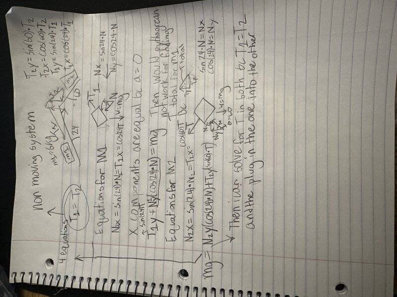 Basically I am going to set the two Tensions equal to eachother because the system is not accelerating then I found the x and y components of both blocks like the normal force in both directions so I can set the y direction stuff like Ny and Ty equal to MG I just don’t know how I can solve my equations without having the normal force component of it in order to take the sin and cosine of it.