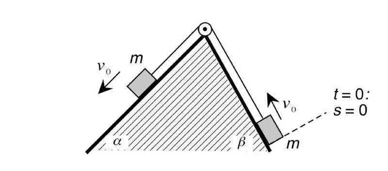 Say the left mass is m1 and the right mass m2 and say ##v_0## is positive.