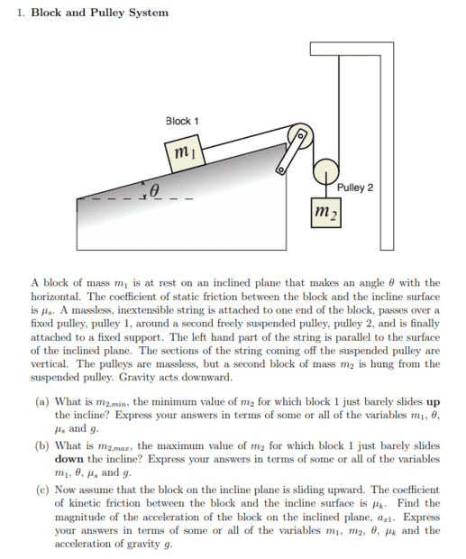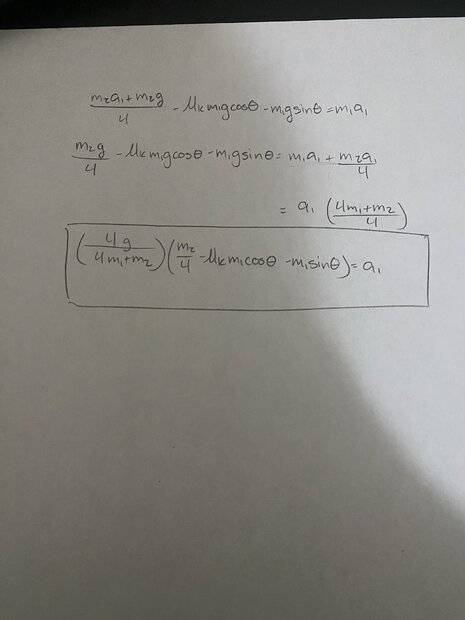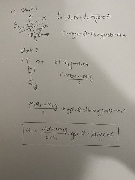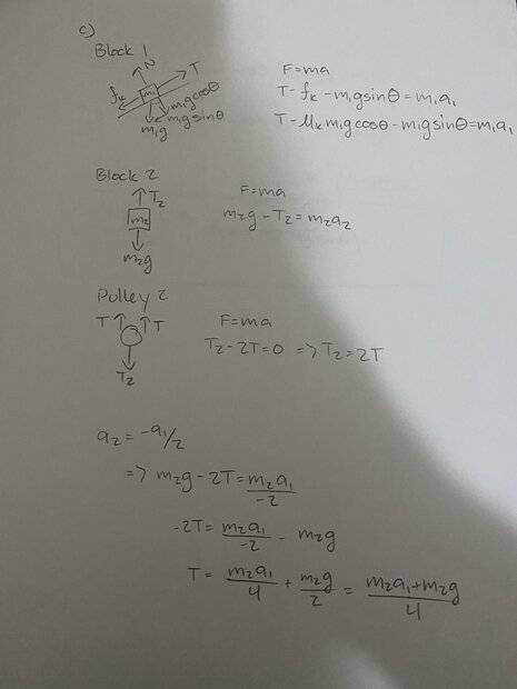 Look at the FBDs below for part (c) where ##m_1## is moving up the incline and ##m_2## is descending.AzimD said:I get that if I were to go the F=ma route and set the Forces to find the T I'd get F=ma such that m_2*g-2T=ma_2 so that T=((ma_2-m_2*g)/2).