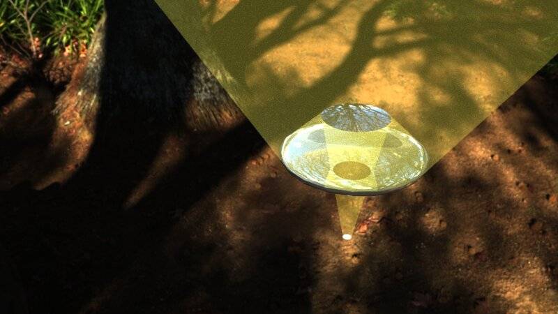 I attached two images i made, just to illustrate the idea. on the bottom there is concave ( or parabolic ? ) mirror that has a hole in the bottom so the rays that are reflected to mirror on the top can pass trough and reach the ground. Sorry for my terminology and my English, i am not an english native speaker nor a physicist haha