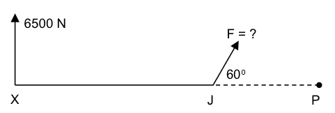 We are given a diagram to which we need to make measurements of. There is a line Y which is 9.5cm long. At one end, point X, is a force of 6,500N going perpendicular to the line; at the other end is point J, which the line continues for another 4.5cm to point P which is the pivot point.