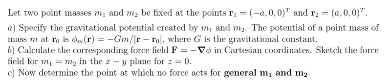 $$\vec{F}= \left(\begin{array}{c} \frac{Gm_1 (x-a)}{((x-a)^2+y^2)^{3/2}} + \frac{G m_2 (x+a)}{((x+a)^2+y^2)^{3/2}} \\ \frac{G m_1 y}{((a+x)^2+y^2)^{3/2}} + \frac{G m_2 y}{((x+a)^2+y^2)^{3/2}} \\ 0 \end{array}\right)$$