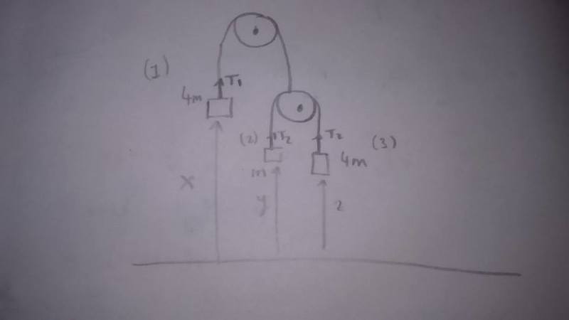 The lagrangian approach is probably easier but I thought I'd try to crank out the answers using Newtonian mechanics. I would show a picture of the set up but the menu above does not seem to have an option unless I provide a URL. For the far left mass, I have $$T_1 - 4mg = 4m \ddot{x} = 4ma_1,$$ where ##a_1## is the acceleration of this mass relative to an inertial frame. Similarly, for the other masses attached to the second pulley, we have $$T_2 - mg = m_{2}a_2\,\,\,\,\text{and}\,\,\,\,T_2 - 4mg = 4ma_{3}$$ where ##a_{2,3}## are the accelerations of masses 2 and 3 relative to an inertial frame. Now, ##T_1 = 2T_2##. Write ##a_{i,P}## as the acceleration of the masses relative to the mobile pulley. So $$a_{i} = a_{i,P} + a_{P}$$ where ##a_P## is the acceleration of the mobile pulley relative to an inertial frame which is equal to -a_1. Rearranging the two equations for masses 2 and 3 above give $$T_2 = \frac{T_1}{2} = m(a_{2,P} - a_1 + g)\,\,\,\,\,\,\,\text{and}\,\,\,\,\,\,T_2 = \frac{T_1}{2} = 4m (a_{3,P} - a_1 +g)$$ Subsequently subbing in ##T_1 = 4m(a_1+g)## gives me 2 eqns with 3 unknowns.