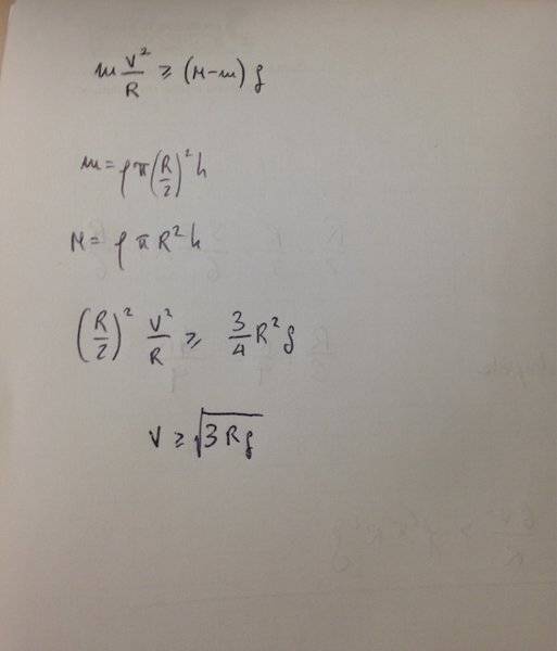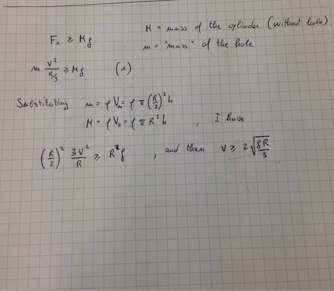 A cart has two cylindrical wheels connected by a weightless horizontal rod using weightless spokes and friction- less axis as shown in the figure. Each of the wheels is made of a homogeneous disc of radius R, and has a cylidrical hole of radius R/2 drilled coaxially at the distance R/3 from the centre of the wheel. The wheels are turned so that the holes point towards each other, and the cart is put into motion on a horizontal floor. What is the critical speed v by which the wheels start jumping?