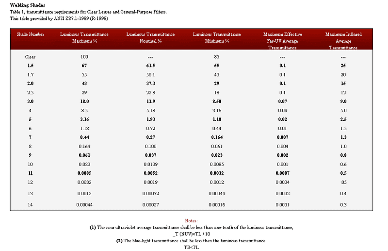 To a good approximation, the visible light follows e^(-n+1) where n is the shade number. As an example, shade n=4 would suggest e^(-3)=0.0498=4.98% transmission - the table says 5.18%. What adds up is "shadenumber-1", so 4+4 is as good as 7 because (4-1)+(4-1)=(7-1).jim hardy said:@Blank_Stare