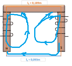 R1 is the reluctance of the circuit within the Ferrite core, where l1 is the mean length of the circuit (=0,189m), μr,core is the relative permeability of the core (≈1000) and A is the cross-sectional area (=7e-4 m2).