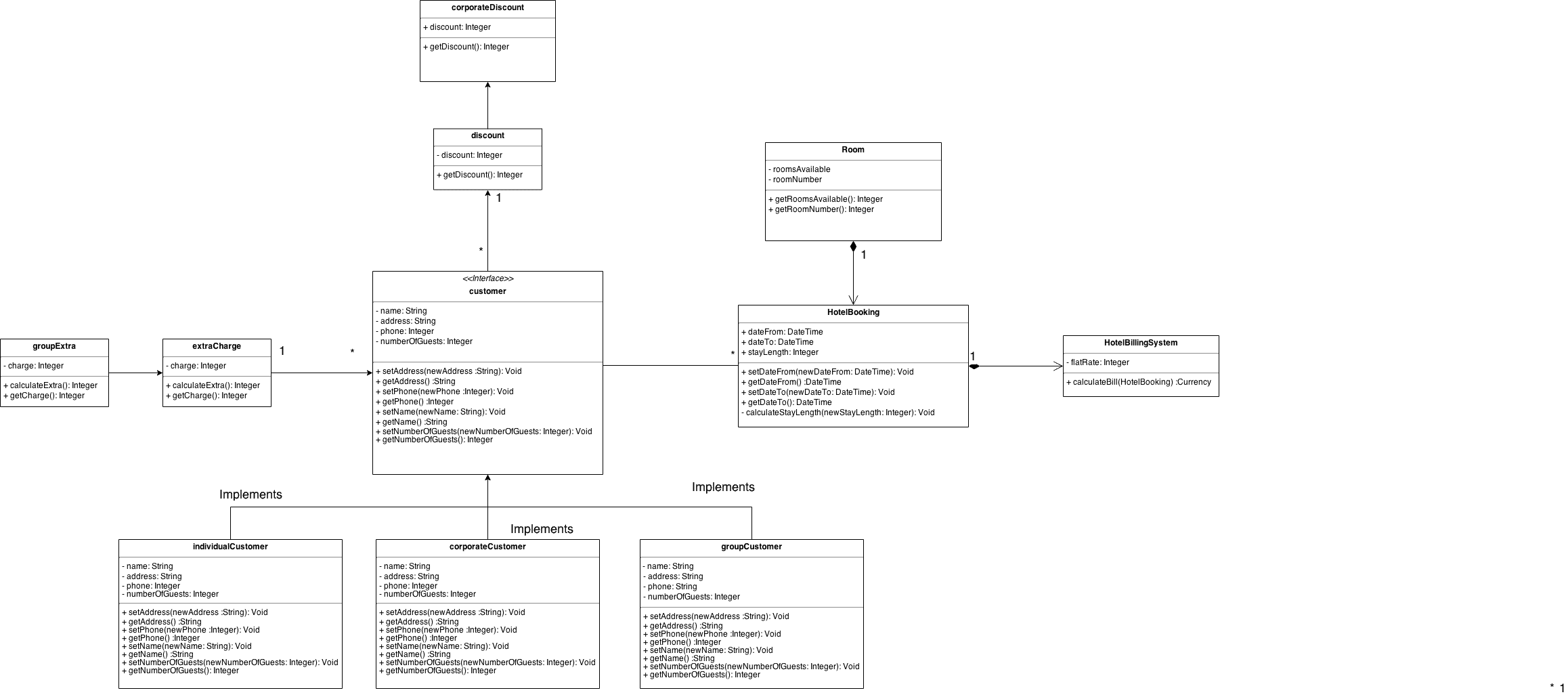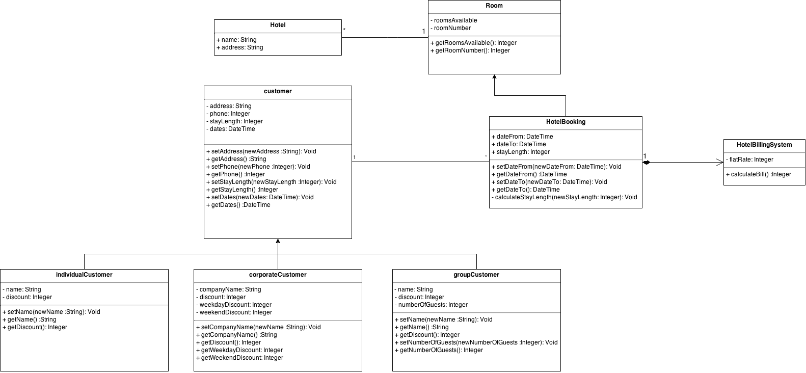 Secondly I'm not sure if I've done what you meant with the customer class? I've got it so the 3 different types of customer all use the customer class as an interface but at the moment they are all identical. I don't have a method for storing a discount that should be applied to that customer as I'm not sure if that is correct. Should the extra charge, seeing as it's only applied to group bookings also go in the 3 different customer classes?