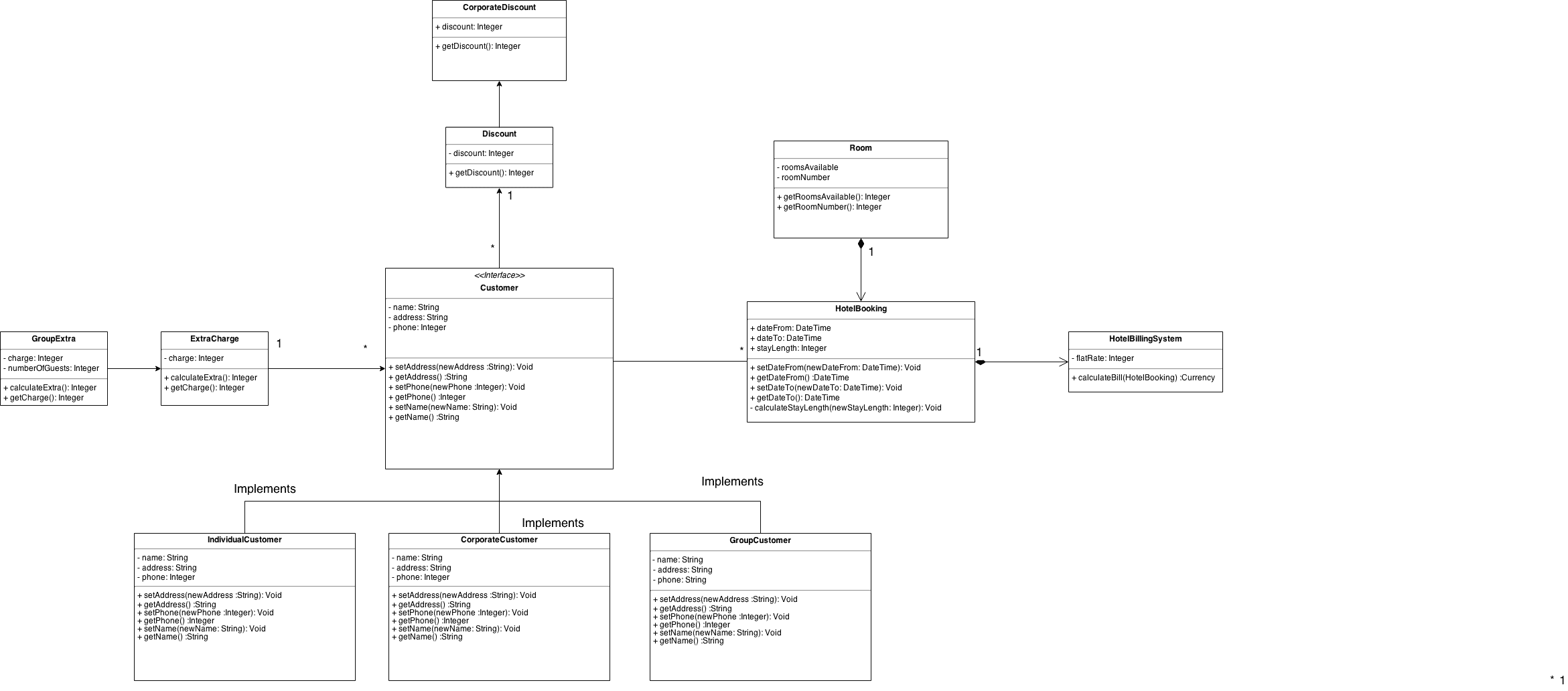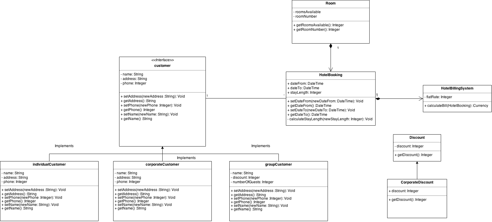 Basically, this changes the perspective from "a corporate customer is a type of customer" to "customers have attributes such as discounts and extra charges which affect the way they are billed, and a corporate customer happens to be a customer with a corporate discount". They don't really teach you this in most CS courses but composition (which is what you are using here: you are composing discounts and charges with the Customer interface to extend behaviour) is usually much more powerful than inheritance, simply because composition behaves better with respect to dependency chains and separation of concerns. For instance, I mentioned in my previous post that you could in principle keep using inheritance by sticking a "calculateBill" on the customer interface. After all, the only difference (from the perspective of the billing system, anyway) between the customers is the way they are billed. But is it really up to the customer classes to calculate their own bill? Not really, because they don't have all the information. For instance, some rooms could be king size and lead to a higher bill, and so on, and at that point you may as well pass the HotelBooking and the flat rate to the customer class, which means the HotelBooking becomes hopelessly coupled to the Customer hierarchy, and they may as well be merged. With composition, on the other hand, the billing system simply takes in the HotelBooking, looks at the room involved, the length of the booking, the customer (and hence the discounts he is entitled to) and computes the bill from that. Much more straightforward, and doesn't lead to the problematic coupling, since the customer is just one additional factor in the billing system, not a critical component of it, and the HotelBillingSystem class actually does what it's supposed to be doing: calculating billls, rather than delegating that somewhere else.