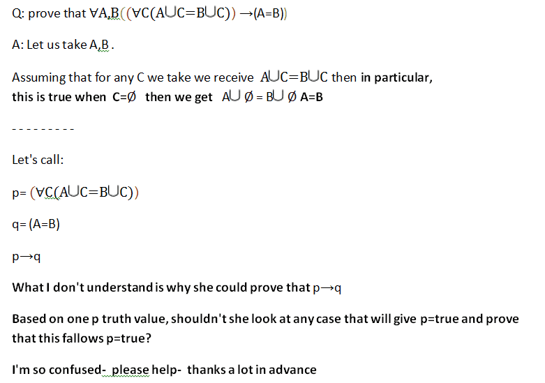 - Another participant clarifies that the professor assumed a specific case where a proposition $p$ is true and seeks to prove a conclusion $q$ based on that assumption.