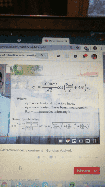 The uncertainty is ## \sigma_r ##. They might do well to call it ## \Delta n ##, but they are using statistical type of language, where ## \sigma ## is the letter they use for standard deviation. And yes, what you have is correct. The uncertainty ## \Delta n=\sigma_r=(\frac{dn}{dx})\sigma_L=(\frac{dn}{dx}) \Delta_{\theta_L} ##. ## \\ ## One additional note: This one is a little tricky, because when you put in ## \Delta \theta_L= \sigma_L ## i this formula, you need to convert it to radians, i.e. express ## \Delta \theta_L ## in radians. The result is ## \Delta \theta_L=2 (\frac{\pi}{180} ) ##.Everywhere else you can use degrees, and it doesn't matter, but here you need to have ## \Delta \theta_L ## in radians. ## \\ ## The reason for this is the derivative of the ## \sin(x) ## is equal to the ## \cos(x) ## only when ## x ## is measured in radians. Otherwise there is an additional factor. (This is kind of an advanced topic. I'll try to explain:) To start this explanation, they are basically writing ## dn=\Delta n=(\frac{dn}{d \theta_L}) \, d \theta_L=(\frac{dn}{d \theta_L}) \, \Delta \theta_L ##. The derivative gives you the cosine only if it is measured in radians. The derivative derivation assumes ## \frac{\sin(\Delta x)}{\Delta x }=1 ## for small ## \Delta x ##, but that is only the case of ## \Delta x ## is measured in radians. If ## \Delta x ## is measured in degrees, then in taking the derivative, the factor that appears of ## \frac{\sin(\Delta x)}{\Delta x} ## for small ##\Delta x ## will give a factor of ## \frac{\pi}{180} ## instead of a factor of one.