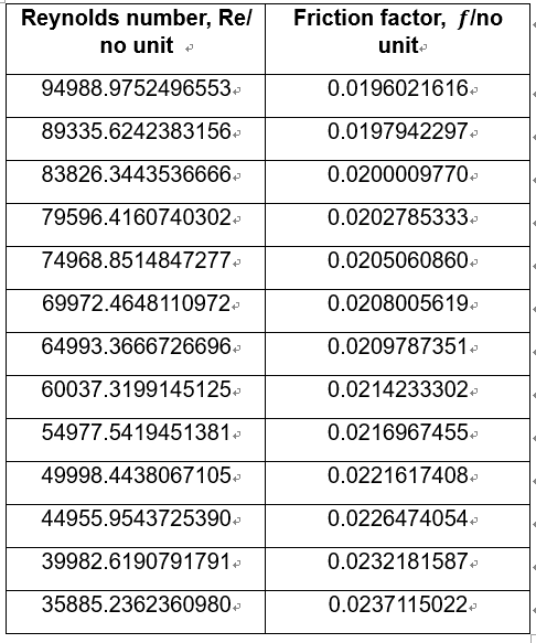 The calculated Re values have been analysed to have an uncertainty of ± 0.4% and the calculated f values an uncertainty of ± 0.1%.