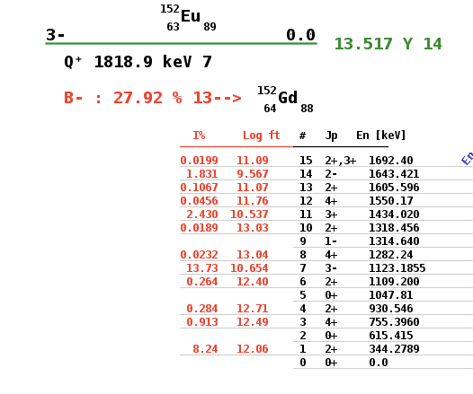 - A participant elaborates on the transition rules, stating that the ground state of 152Eu (3−) to 152Gd (0+) involves a change of Δ J = 3 and a change of parity, categorizing it as a third-order forbidden transition.