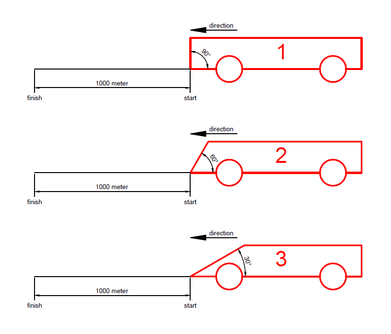 The nose (front) of the car 1 is 90 deg, car 2 is 60 deg, and car 3 is 30 deg.