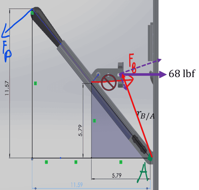 Say in the photo above is a lever arm. I'm trying to backtrack to calculate the force a user must input (yellow) against a force (red). It can pivot around the hinge, and when I calculate the Fr by summing moments around the pivot and solving for Fr, I get around 14lbf. This is designed so that Fp stays horizontal for the range of motion on the arm (not meant to go completely flat).