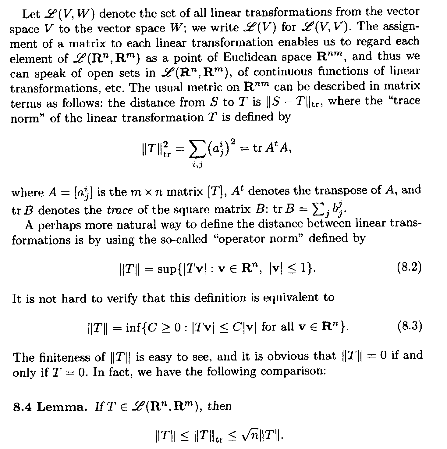 " ... ... The assignment of a matrix to each linear transformation enables us to regard each element of $$\mathscr{L} ( \mathbb{R^n, R^m} )$$ as a point of Euclidean space $$\mathbb{R^{nm} }$$, and thus we can speak of open sets in $$\mathscr{L} ( \mathbb{R^n, R^m} )$$, of continuous functions of linear transformations, etc. ... ... "