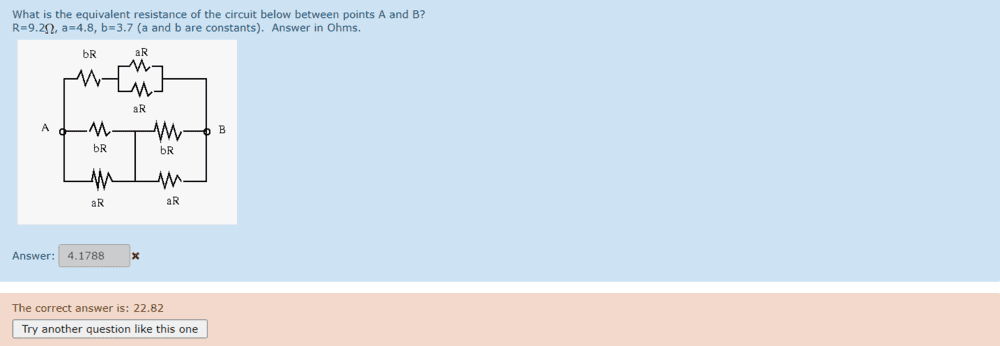 What is causing me confusion is the line in the middle. The first aR and bR are obviously in parallel, but the second aR and bR confuse me. I tried calculating the equivalent resistance from the first aR and bR and then add the equivalent resistance from the second two, but that gave a number way too high. Treating the whole circuit as parallel also gives the wrong answer.