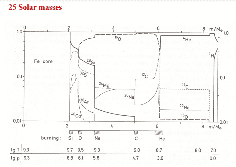 As the title indicates, this figure represents a 25-solar-mass star. I believe it describes the shell structure of the star at the end of its evolution (because of the iron core). However, I'm a little unsure how to read this graph exactly. Especially, I'm having trouble understanding what the y-axis describes? So the x-axis indicates the inner mass m(r) from zero to about 8 solar masses. I believe this makes me able to tell that the inner core from 0-2 solar masses contains iron, the next part gets a little messy. Does it describe that the next layer is a mixture of Ca, Ar, S, and Si and then the y-axis represents the fraction of these elements at the given layer?The next figure is this table: