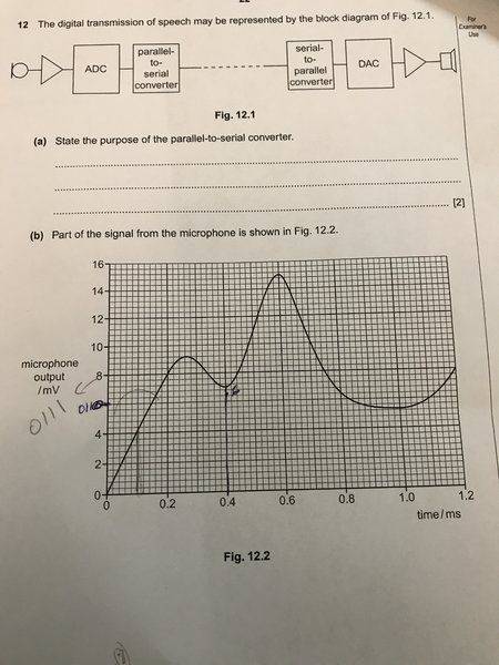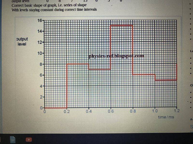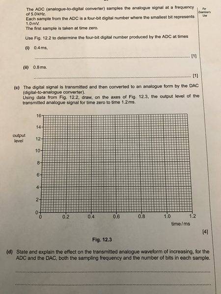 The digitial signal is transmitted and then converted to an analogue form by the DAC. Using data from Fig. 12.2, draw on the axes of Fig.12.3, the output level of the transmitted analogue signal for time zero to time 1.2 ms.