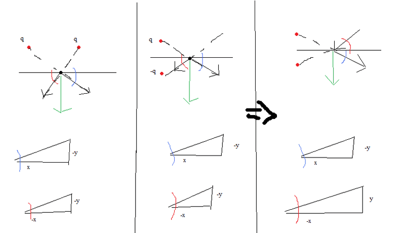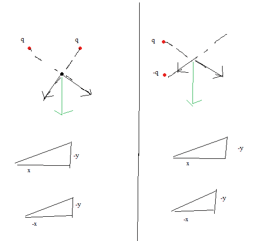 I'm a little confused on how the math is supposed to work out when you are adding an electric field from charges with opposite signs. Looking at the image, both of these situations should yield equivalent electric fields at that point right? I get the right answer for when the situation involves two identical charges, but when the charges are opposite i have an extra negative coefficient from the -q which messes up my calculations. I think the problem is that when I draw triangles to try and split up the components that perhaps my Y should be positive for the -q charge, but I'm not sure if/why that should be the case. Otherwise I'm not really sure what I'm doing wrong...any help would be appreciated.