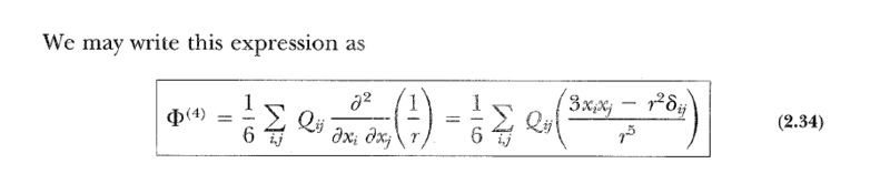 - Another participant explains that the equation represents the quadrupole contribution to the electrostatic potential and discusses the derivation from the Green's function of the Laplace operator, suggesting a connection to multipole moments and spherical harmonics.
