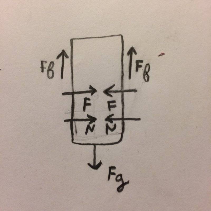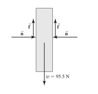 A board sandwiched between two boards in the figure below weighs 95.5N. If friction exists between the middle and the compressing boards, draw the free body diagram of the middle board.