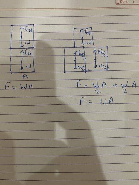 - One participant proposes a mathematical reformulation of the friction equation in terms of area and normal pressure, suggesting that increasing area can influence friction but also noting that effects may cancel out.