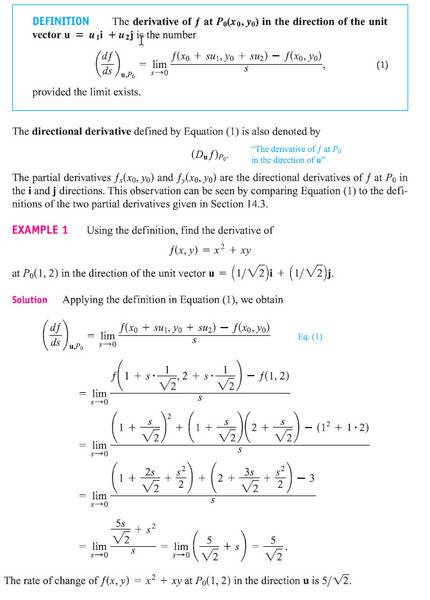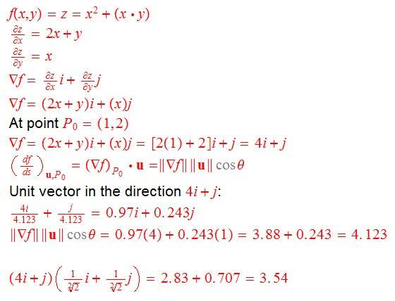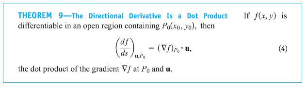 ##\left( \frac{df}{ds}\right) _{u,P_{0}}=\left( \nabla f\right) _{P_{0}}\cdot u =\left\Vert \nabla f\right\Vert \left\Vert u\right\Vert \cos \theta ##