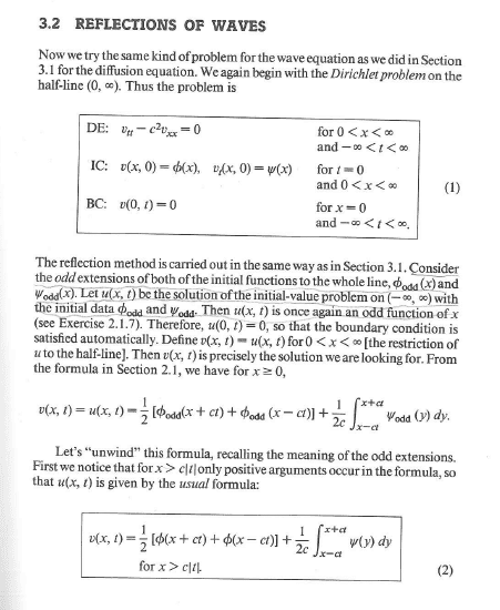 ft(x,0)=ψ(x)ft(x,0)=ψ(x)OK so I am studying the solution method (method of images) given by the nice book Introduction to Partial Differential Equations by Strauss. I will post it and then ask questions.