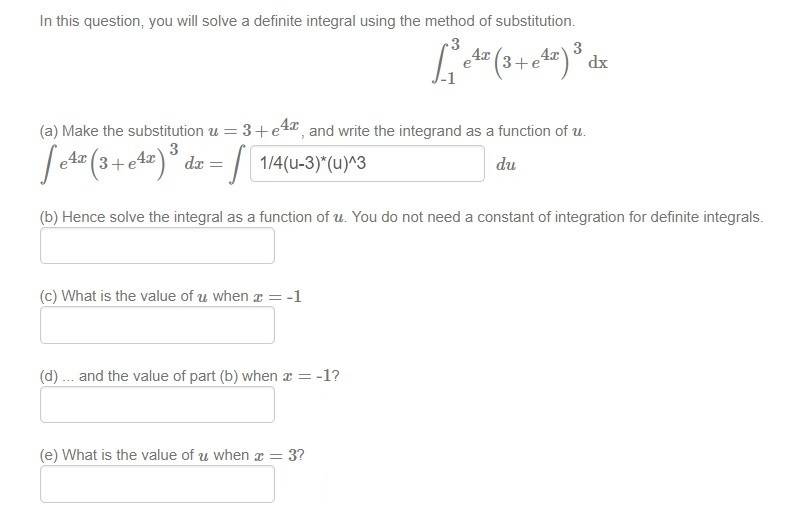 Hi, I posted a question here a few days ago regarding some questions I've been doing on an online quiz. I seem to be getting stuck on the integral substitution questions. I've been slowly making progress, but some of these questions have been confusing me, and reading up on them is only giving me a vague idea of how to progress. I figured that asking someone might be more beneficial to help me find my footing.