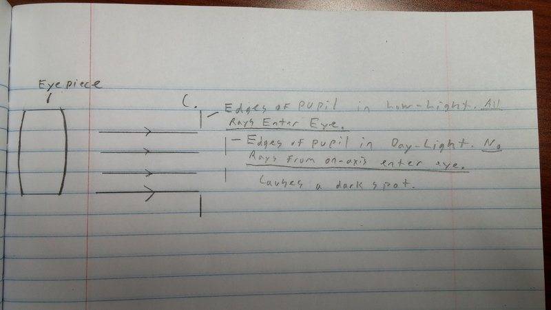 I bought myself a nice 32mm (2" fitting) eyepiece with a 'wide view'. I was disappointed to see a dark patching the middle when I looked through the scope in daylight. I have never been aware of this when looking at (brilliant) wide objects at night. With its wide angle view, it gives the impression of looking out of the spacecraft window. I bumped into a Q and A about various things and it did include this question. The given answer was because of the wide exit pupil of the lens and the narrow aperture of the eye in daylight.