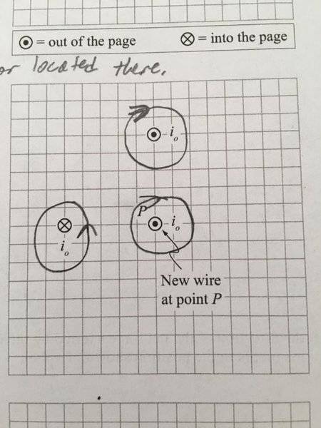 2b. Suppose the a third wire, carrying another current i0 out of the page, passes through point P. Draw a vector on the diagram to indicate the magnetic force, if any, exerted bon the current in the new wire at P. If the magnitude of the force is zero, indicate that explicitly. Explain your reasoning.