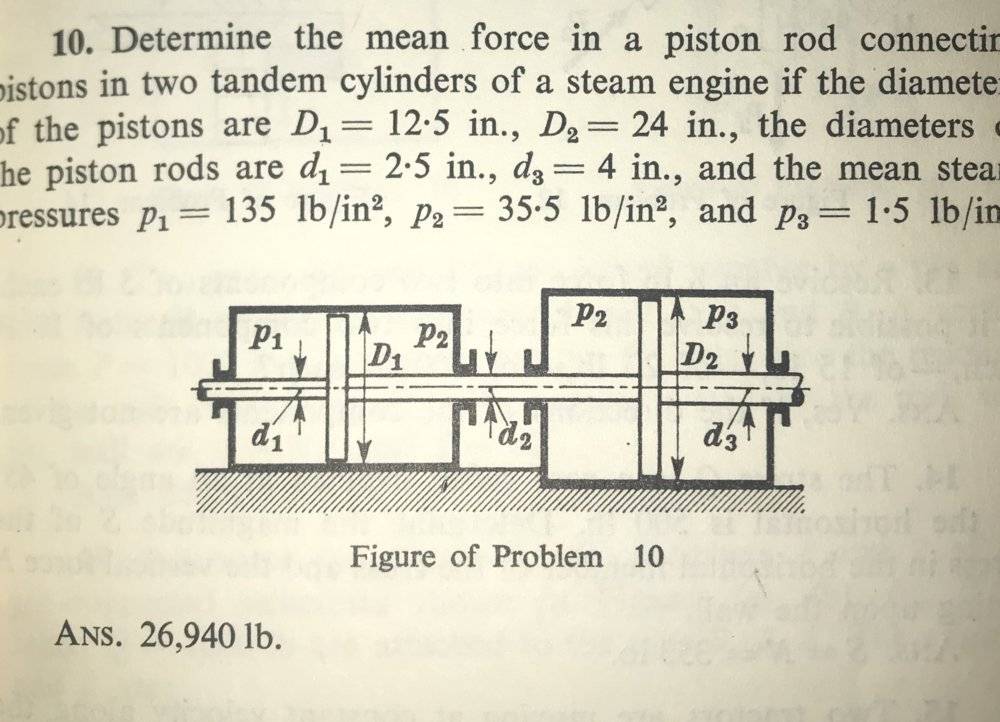 - Determine the mean force in a piston rod connecting pistons in two tandem cylinders of a steam engine if the diameters of the pistons are $$D_{1}$$=12.5 in., $$D_{2}$$=24in., the diameters of the piston rods are $$d_{1}$$=2.5in, $$d_{3}$$=4 in., and the mean steam pressures $$p_{1}$$= 135$$lb/in^{2}$$, $$p_{2}$$= 35.5$$lb/in^{2}$$, and $$p_{3}$$= 1.5$$lb/in^{2}$$.