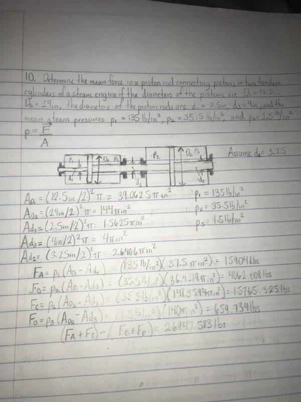 One issue I had was that the diameter of the piston rod d2 is not given. Maybe it was a typo? I don't know. But I made a guess and assumed that it was the average between d1 and d3. Another thing I don't get is what is meant by "mean force," and what exactly is happening in each section of the piston.