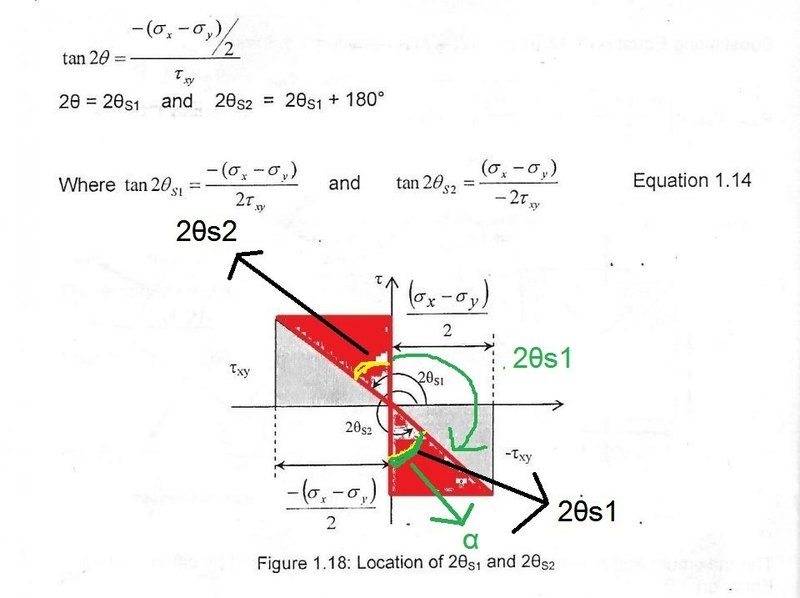 The discussion revolves around the Mohr's Circle formula, specifically focusing on the mathematical interpretation of the angle placement in relation to the triangle used in the analysis. Participants are attempting to understand the relationship expressed by the equation tan(2θs1) = -(σx - σy) / 2τxy and its implications regarding the geometry of the triangle involved.