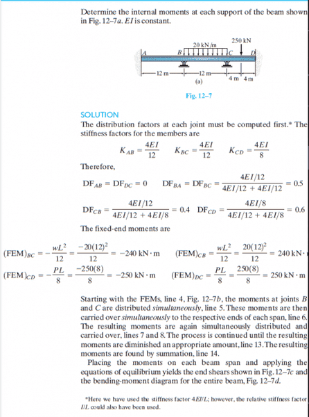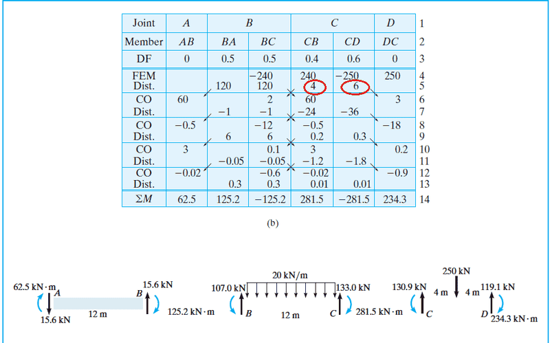 The discussion focuses on the moment distribution method in beam analysis, specifically addressing the calculations for moments at nodes. Participants clarify the redistribution of moments based on determined ratios, with specific values of 240 and 250 being referenced. The calculations involve negating values and redistributing them proportionally between columns at the same node. The final values discussed are 4 and 6, derived from the redistribution process involving the moments at adjacent nodes.