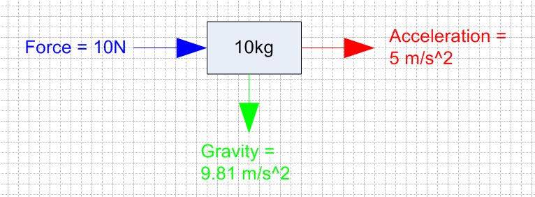 If I had a force of 10Newtons pushing an object along the ground (assume no friction) in a perfectly horizontal direction that has a Mass of 10kg then the objects acceleration would be 5m/s^2 in the horizontal direction.