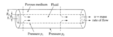 An incompressible fluid flows through a porous cylindrical shell with inner and outer radii R1 and R2, respectively under steady state conditions. At these surfaces, the pressures are known to be p1 and p2 respectively. The length of the cylindrical shell is h.