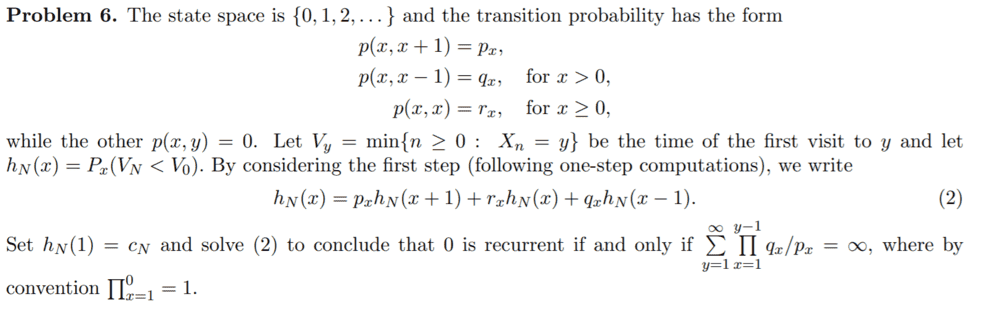 The discussion focuses on the mathematical relationship between hN(1) and cN in the context of recurrence in probability theory. The user expresses confusion about solving the equation hN(1) = cN and its implications for determining the recurrence of state 0 when qx/px approaches infinity. The conclusion drawn is that state 0 is recurrent if and only if the ratio qx/px equals infinity, highlighting the critical relationship between these variables in probability analysis.