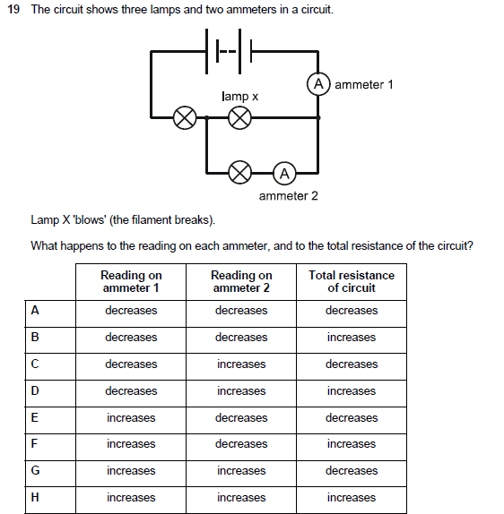 The discussion revolves around understanding the effects of a blown bulb in a circuit, specifically focusing on resistance and voltage changes in a series-parallel circuit configuration. The participants are exploring how these changes impact current readings in ammeters connected to the circuit.